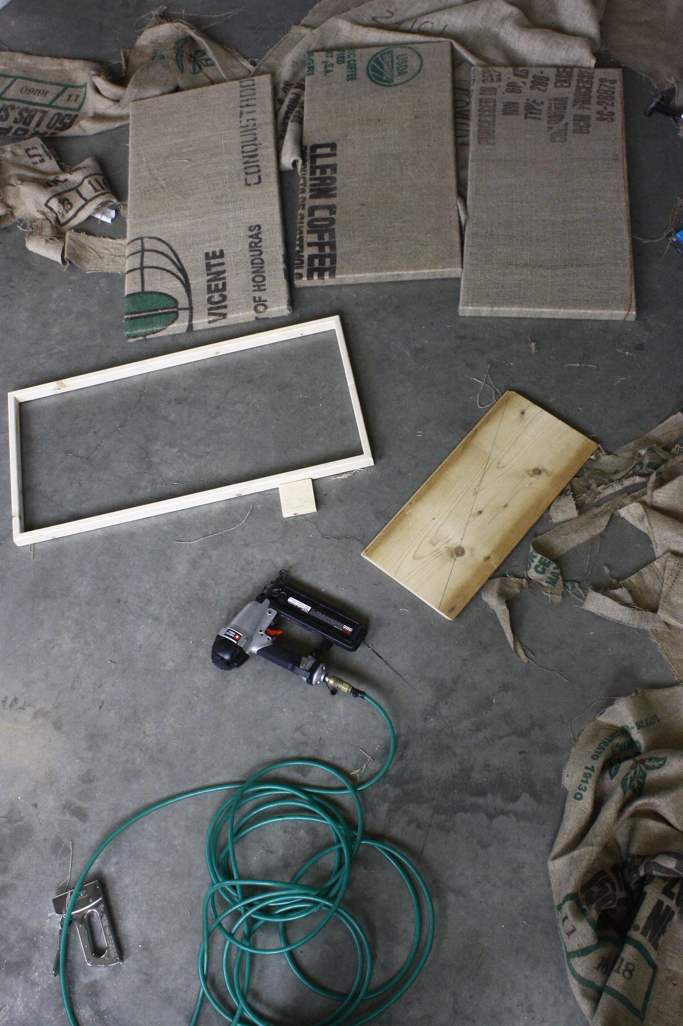 Kris and I finished up the slatted area of the kitchen then after a little sketching and discussion on the size, spacing and orientation, we began to assemble frames and remove the seams from the bags. Stretching the burlap was a fairly smooth process, after the realization that my hands were more successful than the canvas pliers, intended for stretching canvas- and tearing burlap. By the end of it the floor was covered in the tattered remains of unused bags, some coffee bean stragglers, staples, etc, etc.. Messes follow me.